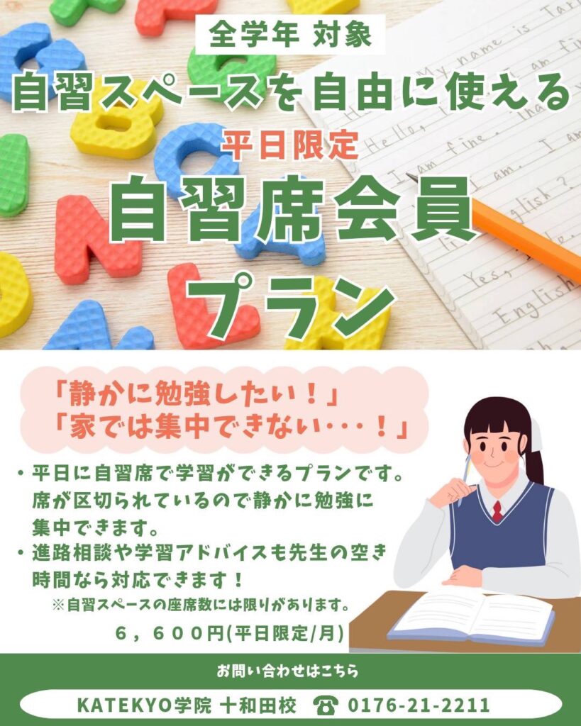 KATEKYO学院十和田校では、小学生向けの英語教室、平日限定で自習席を自由に使えるプラン(三本木高校・附属中学校の生徒さんにおススメ!)もご用意しております。