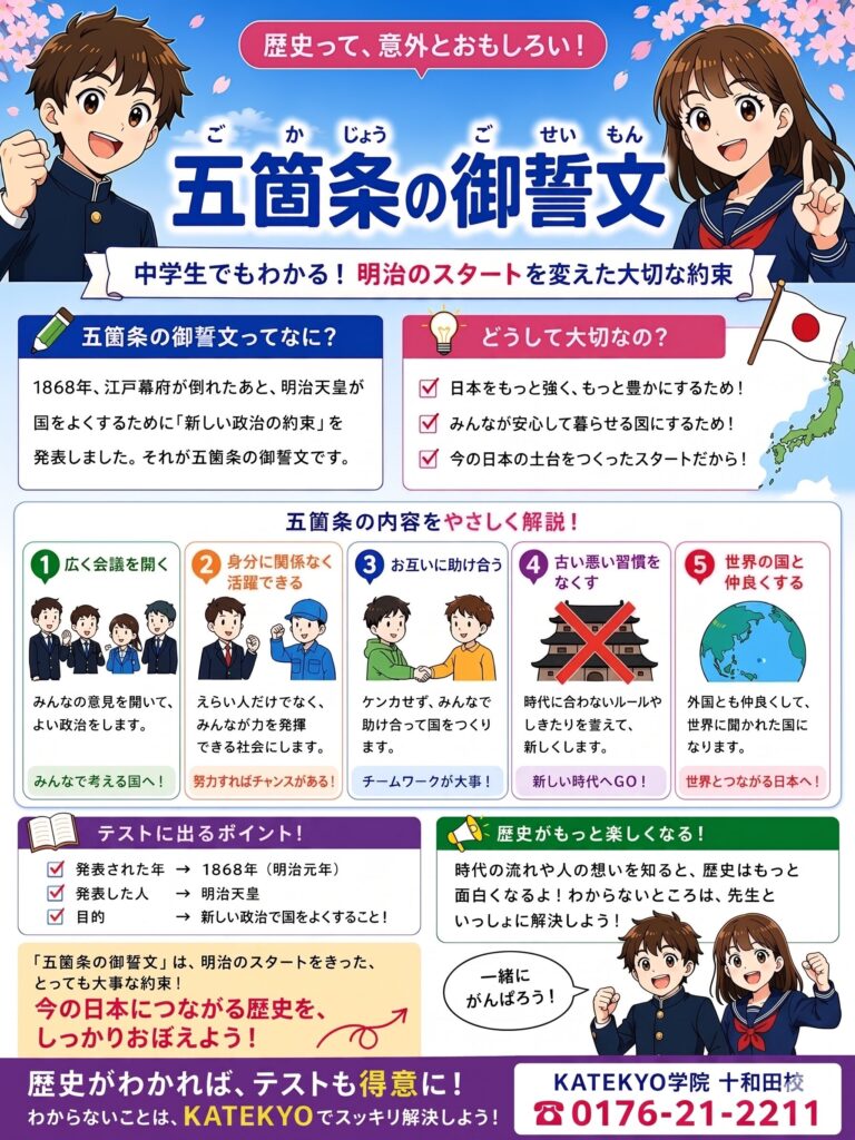 五箇条の御誓文とは1868年、江戸幕府が倒れた後、明治天皇が神々に誓う形式で発表された新政府の基本方針が 五箇条の御誓文(ごかじょうのごせいもん) です。