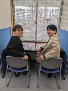 KATEKYO学院青森観光通り校の、櫻井飛嘉先生(左)と、上田貴裕先生(右)の二人で出演します!教室責任者の深澤は、テレビカメラで撮られている二人を撮る係、バックアップクルーとして参加します。